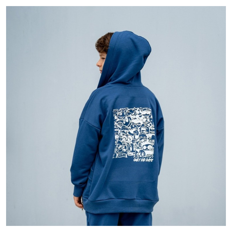 Mikina má moderný oversize strih so zníženými ramenami, praktické vrecká na prednej strane a výraznú grafickú potlač na chrbte, ktorá dodáva jedinečný mestský look. Predná časť je doplnená o zips po celej dĺžke, čo uľahčuje obliekanie.