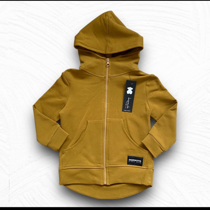 Mikina s kapucňou má moderný minimalistický dizajn, praktické zapínanie na zips a predné vrecká. Na zadnej strane zdobí mikinu nápis DESPACITO, ktorý dodáva celému outfitu jedinečný štýl.
