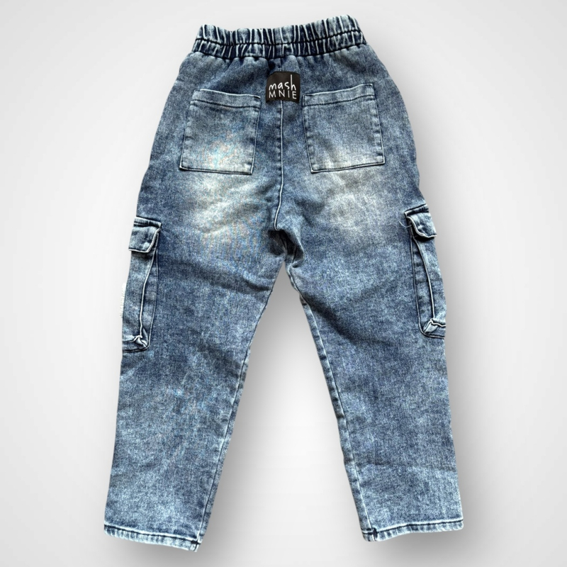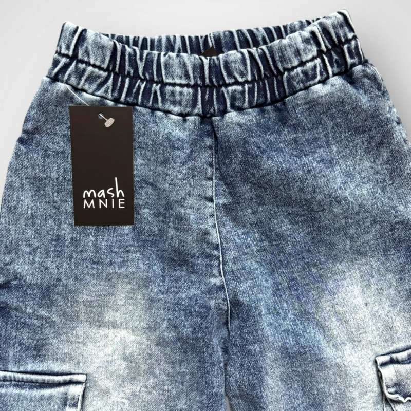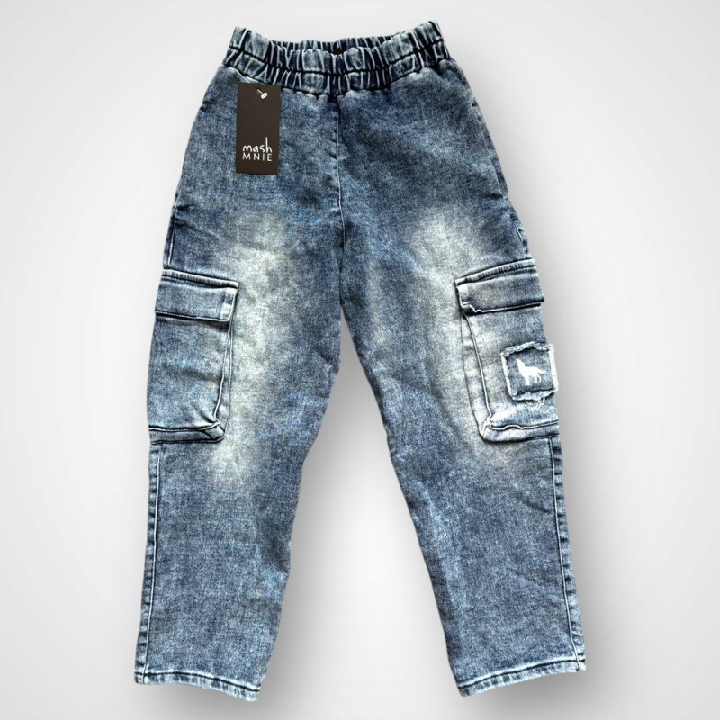 Chlapčenské cargo rifle mashMNIE sú ideálnou voľbou pre moderný a pohodlný outfit. Vyrobené z kvalitného denimu so spraným efektom, ktorý dodáva nohaviciam štýlový vzhľad. Praktické cargo vrecká na bokoch a zadné vrecká poskytujú dostatok priestoru na drobnosti. Elastický pás zabezpečuje komfort pri nosení a jednoduché obliekanie. Nohavice majú voľnejší strih, ktorý neobmedzuje pohyb a je vhodný na každodenné nosenie.