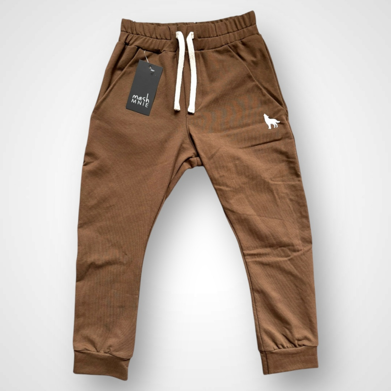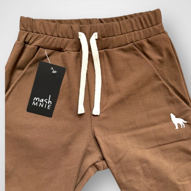 Štýlové chlapčenské tepláky mashMNIE z novej kolekcie v modernom minimalistickom dizajne. Vyrobené z kvalitnej bavlnenej teplákoviny, ktorá je príjemná na dotyk a pohodlná na každodenné nosenie. Elastický pás so šnúrkou umožňuje ideálne prispôsobenie, manžety na spodku nohavíc držia tvar a chránia pred chladom. Na boku je decentné logo značky mashMNIE – vlk, ktorý dodáva nohaviciam jedinečný charakter.