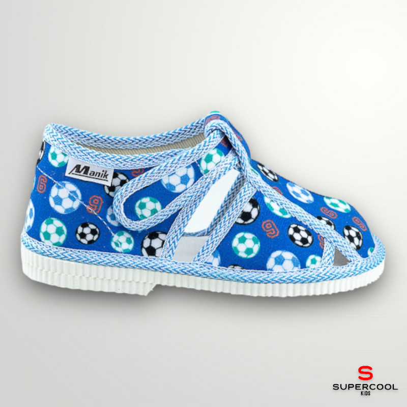 Detské pohodlné sandálové papuče s uzavretou špicou a zapínaním na suchý zips s motívom futbalových lôpt. Jednoduché zapínanie je vhodné aj pre najmenšie deti. Papuče sú vyrobené z ľahkých a pružných materiálov, v klenbovej časti sú navyše vystužené tuhou penou pre podporu zdravého vývoja detskej nožičky. Strih papučiek je prispôsobený detskému chodidlu, tak aby nespôsobovali deformáciu pri vývoji chodidla. Papuče sú určené pre používanie v interiéri, či už na doma, alebo do škôlky, školy ako prezuvky.