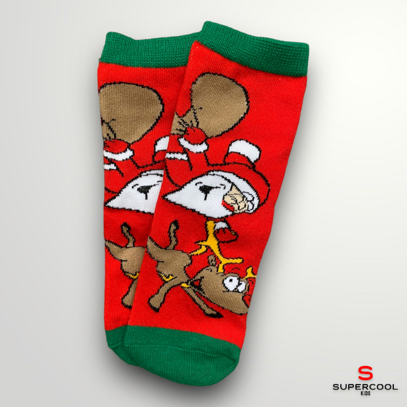 Detské vianočné bavlnené ponožky vo výhodnom darčekovom štvorbalení s vtipnými vianočnými motívmi (Santa, snehuliak, sobík, macko). Ponožky sú vhodné pre dievčatá aj chlapcov ako vianočný darček, ku vianočnému stromčeku, na vianočné fotenie, ale aj na bežné nosenie. Ponožky sa predávajú ako dačekové štvorbalenie, v ktorom sú vždy 4 páry ponožiek s rôznymi motívmi. Darčekové balenie ponožiek je v 3 farbách podľa veľkosti: modré (19-23), červené (25-29) a zelené (30-34).
