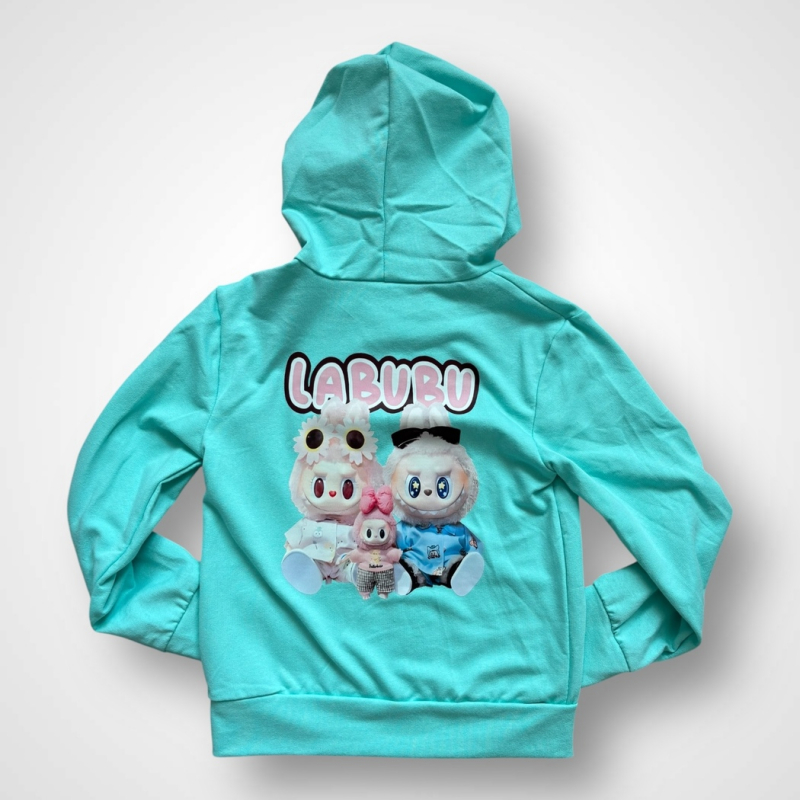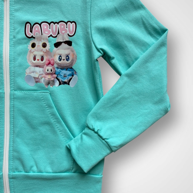 Dievčenská bavlnená mikina na zips s kapucňou, vpredu a na chrbáte s potlačou LABUBU rodinky. Viac informácií ohľadne starostlivosti o oblečenie nájdete v záložke PARAMETRE v časti Starostlivosť.
