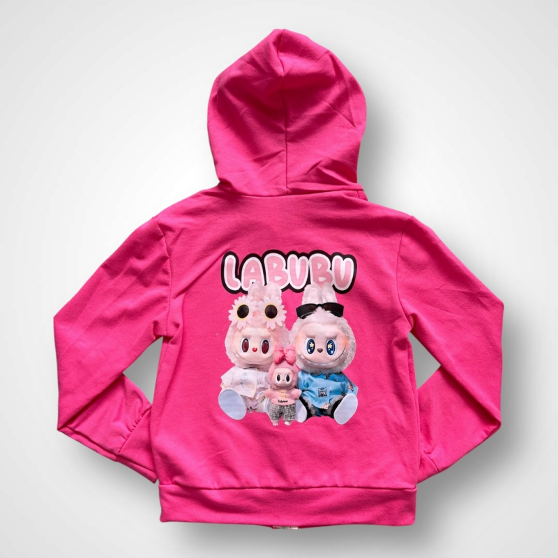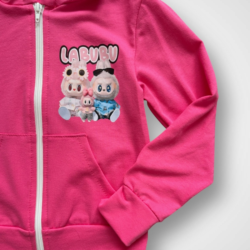 Dievčenská bavlnená mikina na zips s kapucňou, vpredu a na chrbáte s potlačou LABUBU rodinky. Viac informácií ohľadne starostlivosti o oblečenie nájdete v záložke PARAMETRE v časti Starostlivosť.
