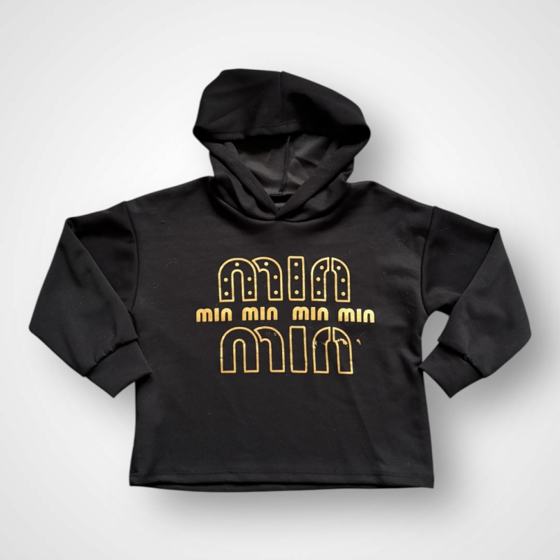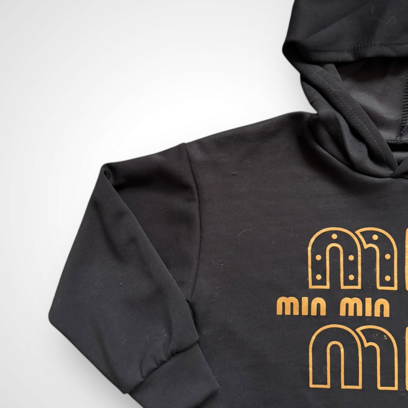 Dievčenská súprava mikina a tepláky s nápisom MIN MIN. Mikina s kapucňou, vpredu so zlatým nápisom MIN MIN. Tepláky voľného strihu s gumou v páse. Viac informácií ohľadne starostlivosti o oblečenie nájdete v záložke PARAMETRE v časti Starostlivosť.
