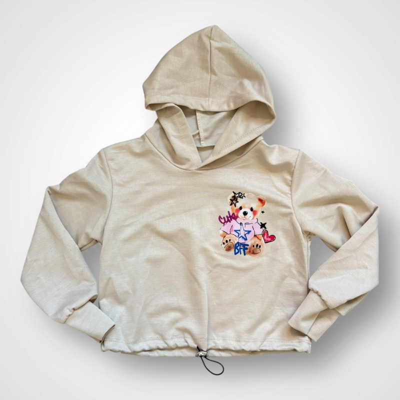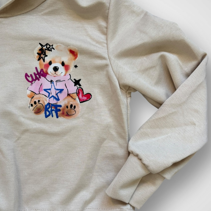 Dievčenská súprava mikina a tepláky s medvedíkom. Mikina crop strihu s kapucňou, vpredu aj vzadu s potlačou medvedíka BFF, dole sťahovacia. Tepláky voľného strihu s gumou v páse a funkčnou šnúrkou. Viac informácií ohľadne starostlivosti o oblečenie nájdete v záložke PARAMETRE v časti Starostlivosť.