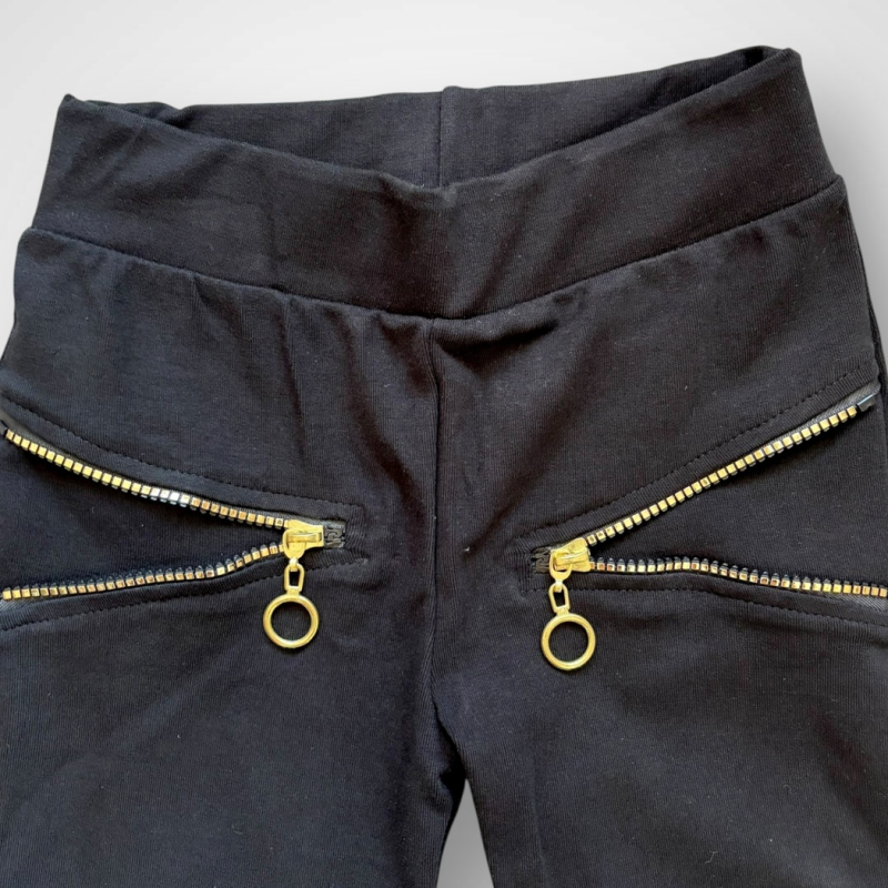 Najvýraznejším detailom sú dva dekoratívne zipsy so zlatými krúžkami na prednej časti, ktoré dodávajú legínam moderný a originálny vzhľad. Vďaka jednoduchému, no štýlovému dizajnu sa dajú ľahko kombinovať s tunikami, mikinami či svetríkmi a sú vhodné na bežné nosenie aj na špeciálne príležitosti.