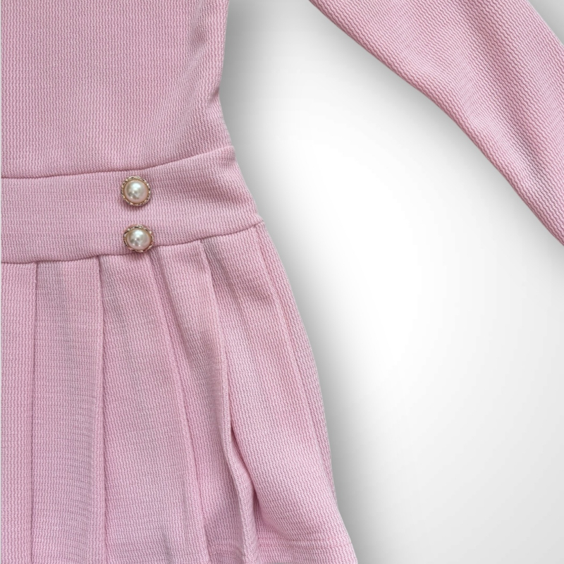 Dievčenské elegantné šaty s dlhým rukávom, ktoré majú košielkový golierik a sú zdobené zlatými gombíkmi. Dostupné v 2 farbách: ružová a béžová. Viac informácií ohľadne starostlivosti o oblečenie nájdete v záložke PARAMETRE v časti Starostlivosť.