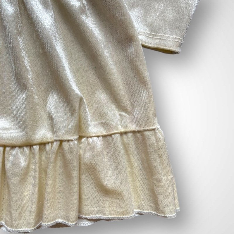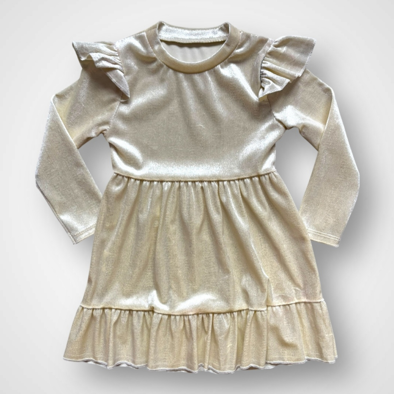 Dievčenské elegantné trblietavé šaty s dlhým rukávom, na rukávoch zdobené volánmi, dole mierne rozšírené. V cene šiat aj cross kabelka v rovnakej farbe ZADARMO. Viac informácií ohľadne starostlivosti o oblečenie nájdete v záložke PARAMETRE v časti Starostlivosť.