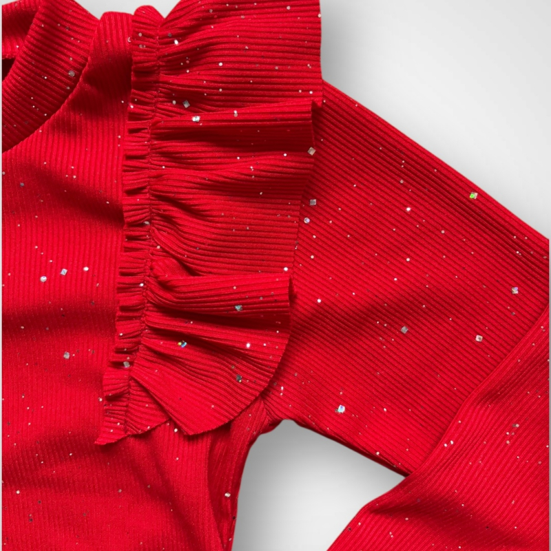 Dievčenské jemne vrúbkované tričko s dlhým rukávom zdobené volánikmi, cele s trblietkami. Viac informácií ohľadne starostlivosti o oblečenie nájdete v záložke PARAMETRE v časti Starostlivosť.
