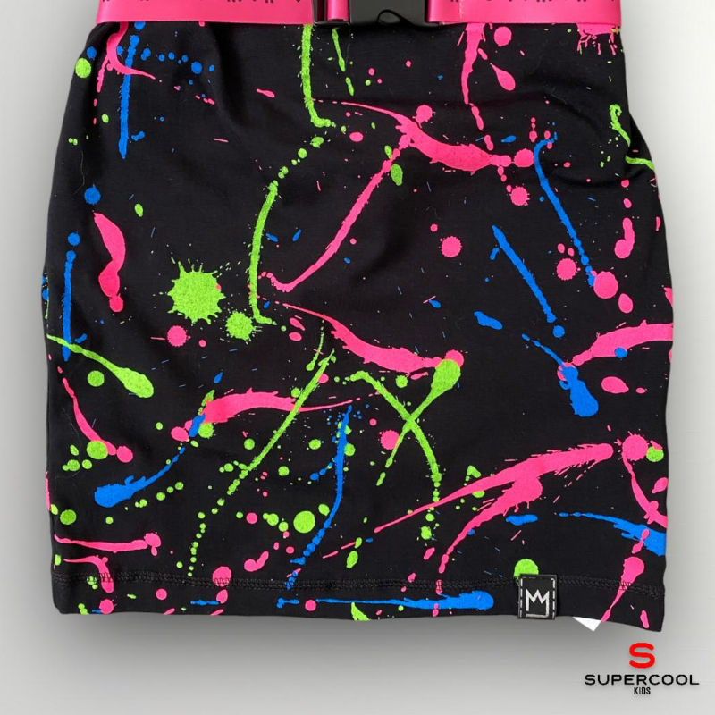 Bavlnené žiarivými farbami striekané šaty s krátkym rukávom, predĺžené, doplnené opaskom s nápismi "mimi". Výrobca dodáva opasok v troch farbách, ružovej, bielej alebo čiernej.