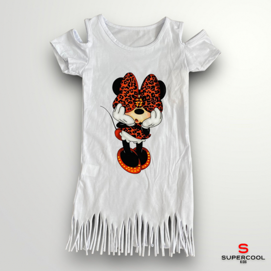 Dievčenské tenké letné bavlnené šaty s krátkym rukávom a výstrihom na ramenách, dole strapcové, vpredu s veľkým obrázkom Minnie. Šaty sú dostupné v 5 farbách: biela, fuchsia, tyrkysová, ružová a fialová. Vhodné na letnú dovolenku, či bežné nosenie.