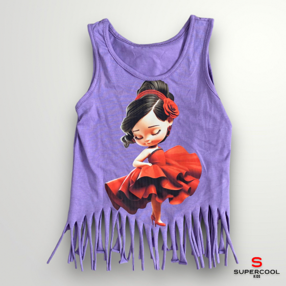Dievčenské tenké letné bavlnené tielko, v spodnej časti strapcové, vpredu s veľkým obrázkom dievčatka v šatách. Tielko je dostupné v 6 farbách: biela, tyrkysová, ružová, fialová, čierna a svetloružová. Vhodné na letnú dovolenku, či bežné nosenie.